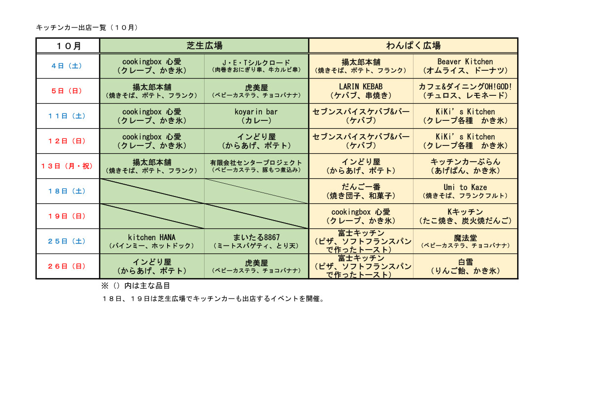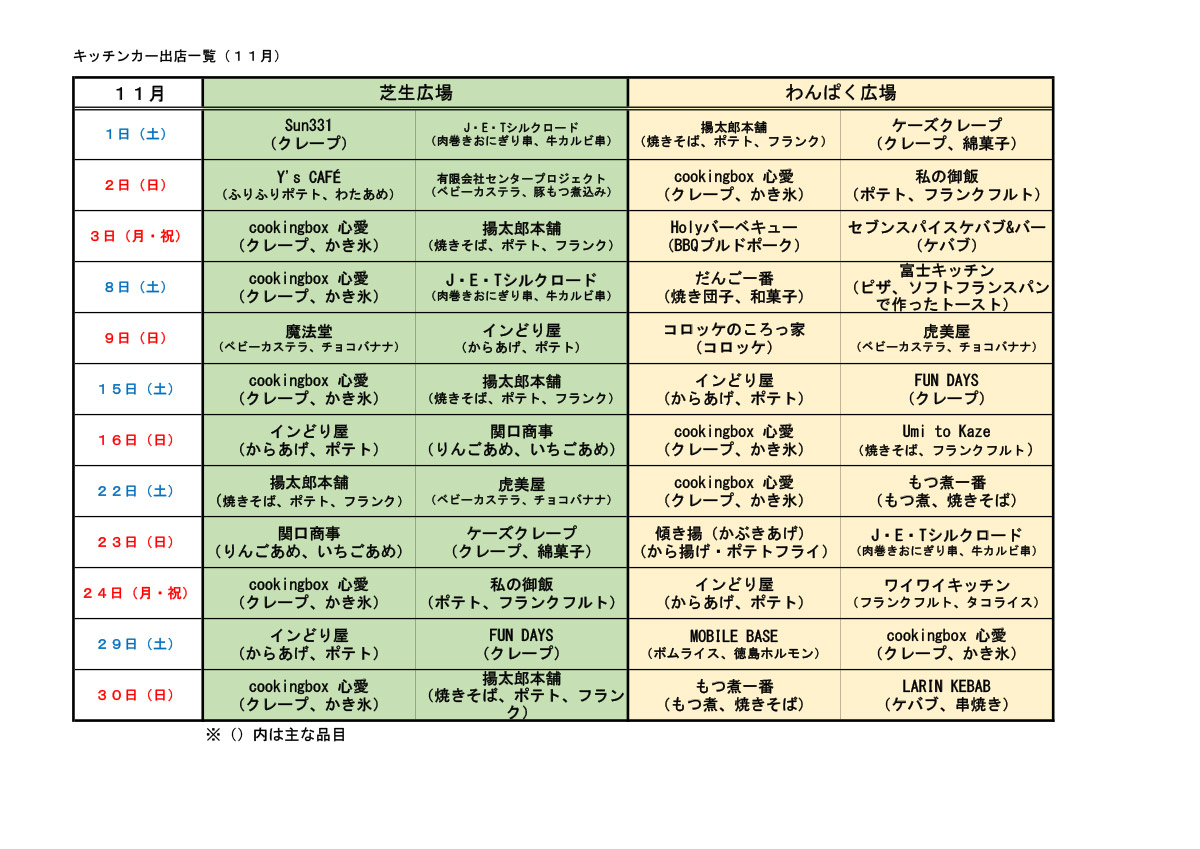 令和7年10月4日(土)から11月30日(日)までの土、日曜、祝日キッチンカーが出店します。