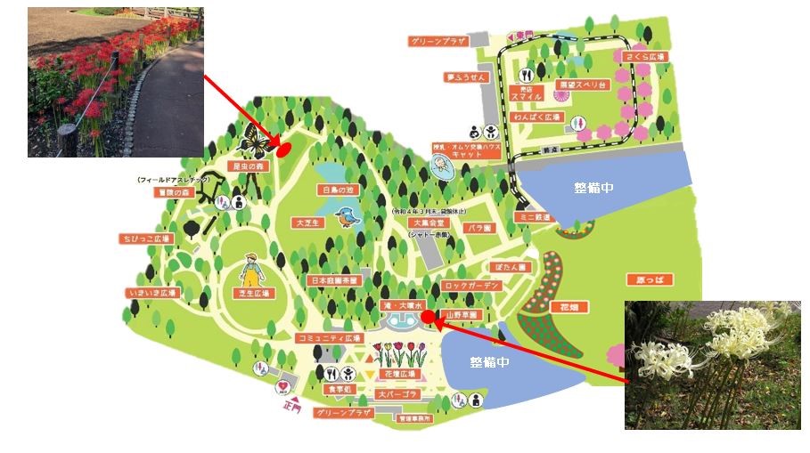 ヒガンバナの赤花は『ほたるの里花畑脇』で、白花は『山野草園奥』で見ることができます。