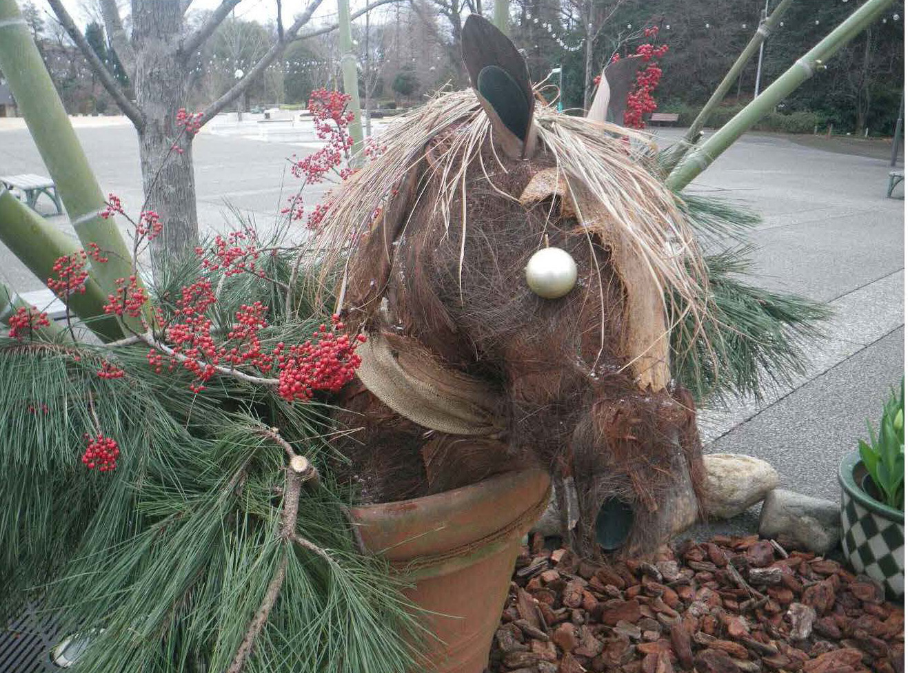 制作に使用した材料は、園内の剪定作業中に出た「木の枝」、園内で採取した「実がついた枝」や「ヤシ類の繊維」、「装飾用品」などです。