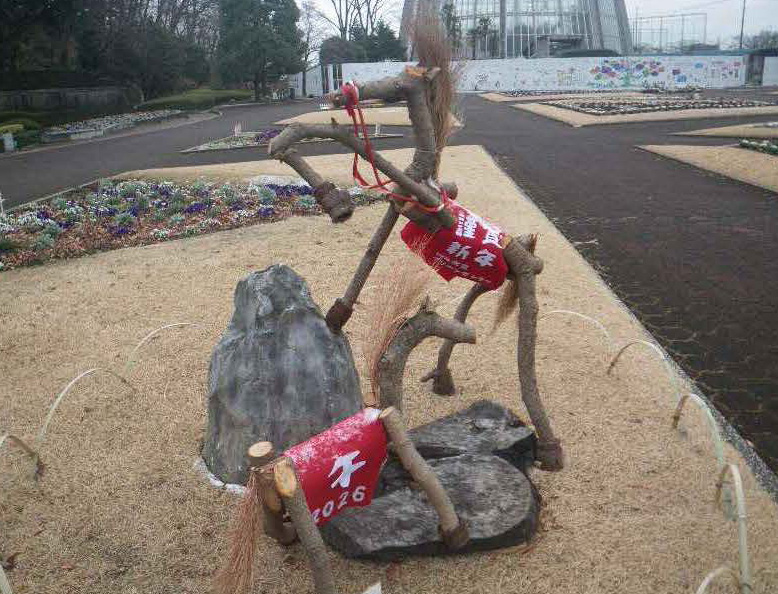 園内で採取した植物や、園芸資材などを使って2026年の干支「馬」を製作しました。