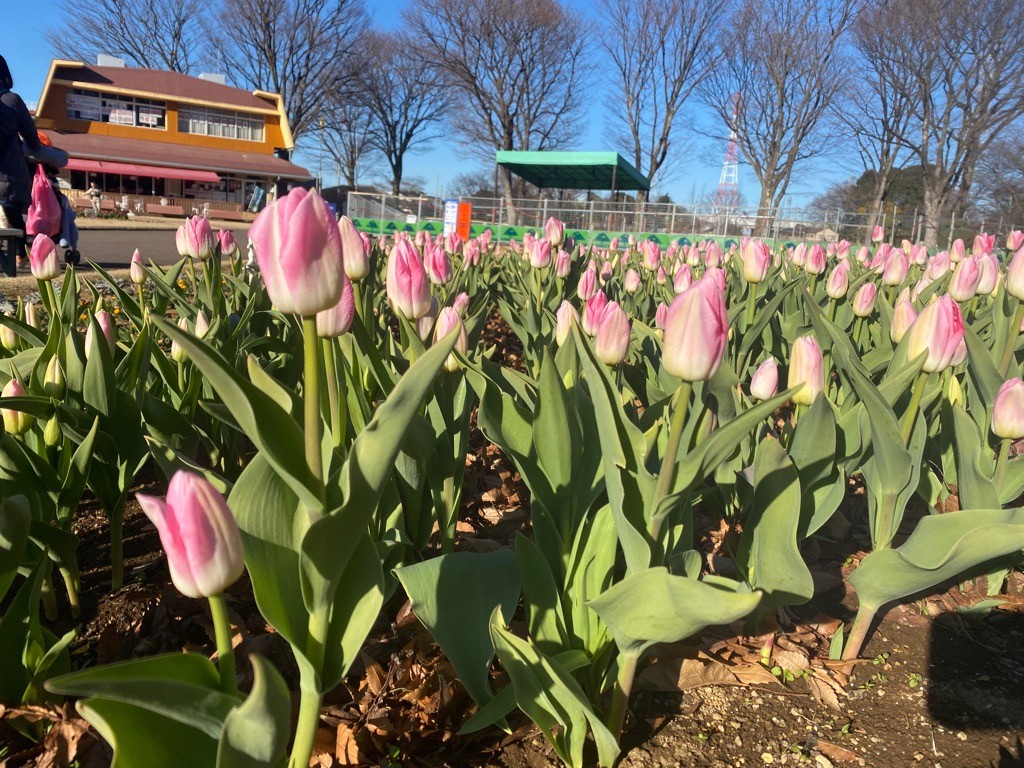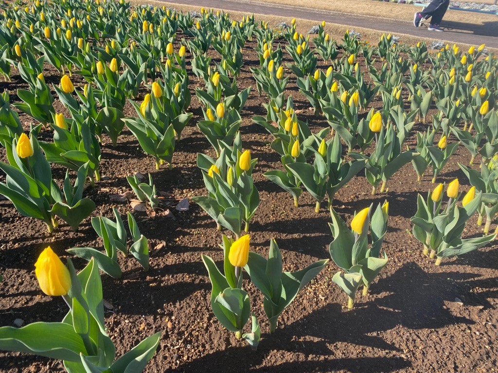 グリーンセンターでは、滝前花壇でアイスチューリップを植栽しています。低温処理により開花時期を早めたチューリップです。赤・ピンク・黄の3色のチューリップが植えてあります。