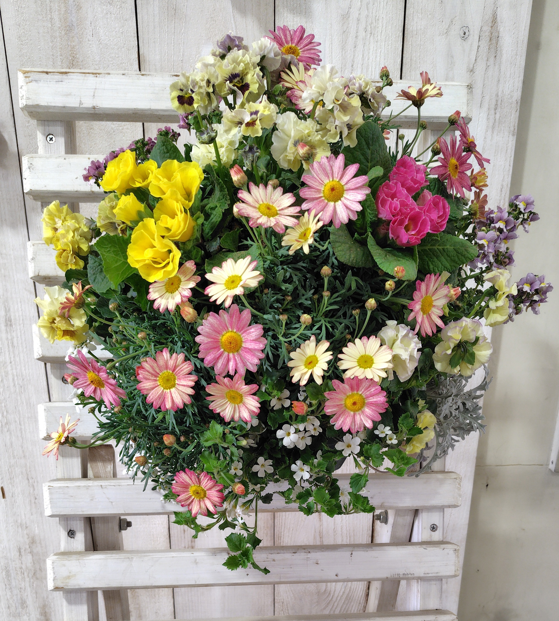春色の可愛らしい花々で壁掛け型のハンギングバスケットを作ります。